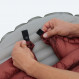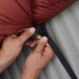 Deux sangles élastiques à boucles permettent de fixer le quilt au matelas (compatible avec des largeurs de 50 à 60 centimètres). Ces sangles sont réglables pour ajuster le serrage en fonction des températures rencontrées et pouvoir rester bien au chaud sans courant d’air. Au niveau du cou, un bouton pression et un élastique réduisent les pertes de chaleur.
