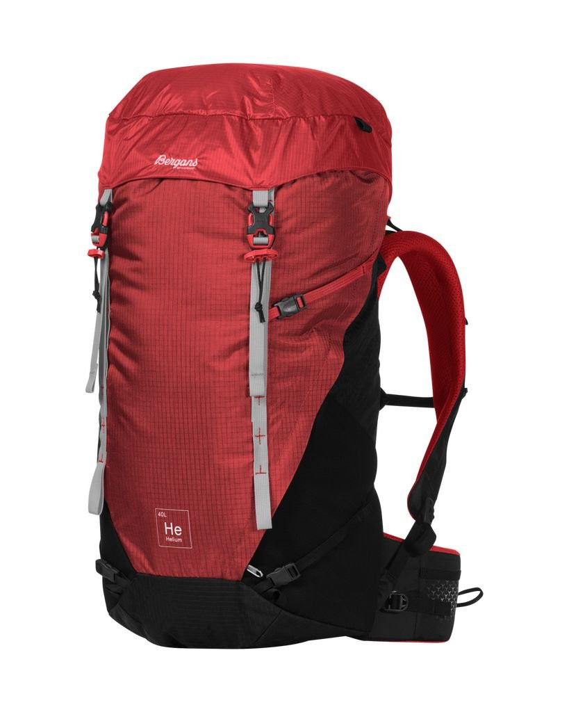 Le tissu créé par Bergans of Norway est un mélange de nylon 66 et de fibre Dyneema, il est à la fois léger, durable et très résistant. L'Helium V5 W 40 possède un dos réglable, une armature rigide, une ceinture de hanche généreuse et une ceinture de poitrine. La ceinture de hanche est amovible et il est possible de fixer dessus le rabat du sac pour disposer d'un sac banane !